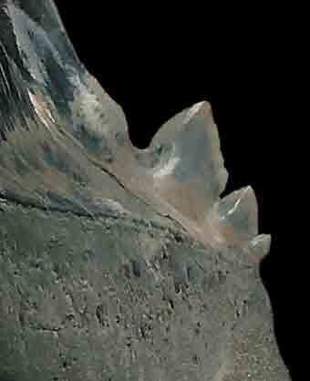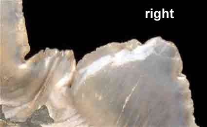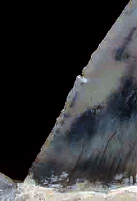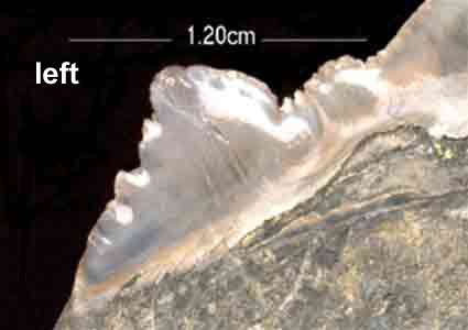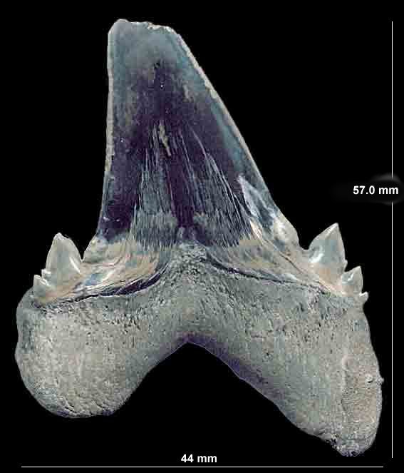 Otodus obliquus teeth are found quite often on Sheppey, however teeth with serrations are extremely rare. In the words of a good friend of mine, "as rare as hens teeth". There is some debate as to whether these serrations are due to the shark being of extreme age, or that of an evolutionary development towards later forms is taking place. I hope that someone can put me right on this issue. The examples that I am able to exhibit on this page were found almost at opposite ends of the section. One was found at Paddies Point at the far westerly end, which is the youngest part of the section, where division D of the London clay moves into division E. The other was found at Warden Point, towards the easterly end of the section, much earlier in division D. The tooth could have come from the top of the cliff which would place it nearer in time to the Paddies Point specimen, but there could be as much as 3 million years between them | ||