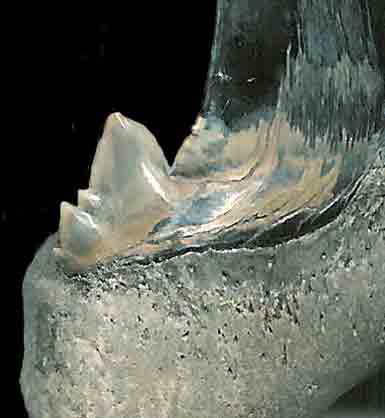 This tooth was found by Don Pople of the Medway Mineral and Lapidary Society at Warden Point while scanning the deposits on the beach for Shark's teeth. It is a unique specimen, and is wonderfully preserved. Note the serrations on the lateral cusps. | ||