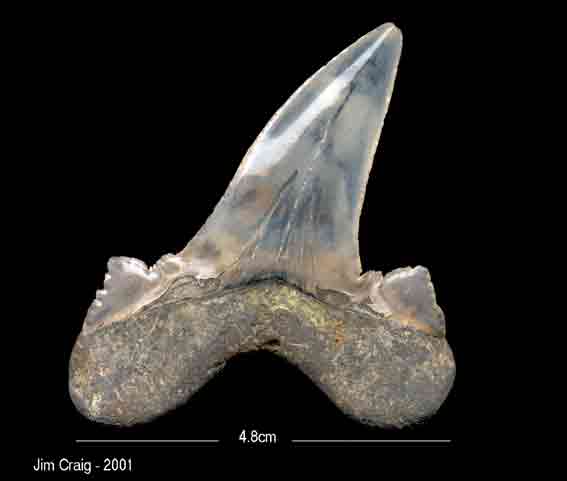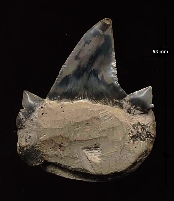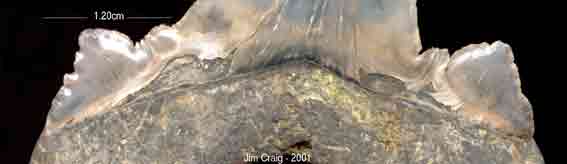 This specimen was found near to Paddies point and may be slightly pathalogical, but the serrations are clearly evident either side of the blade. Collection of Jim Craig | ||